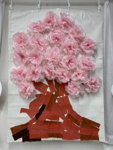 また、創作活動では桜の木の制作を行っています。折り紙や色紙を使い、皆で協力して一本の大きな桜の木を完成させていきます。